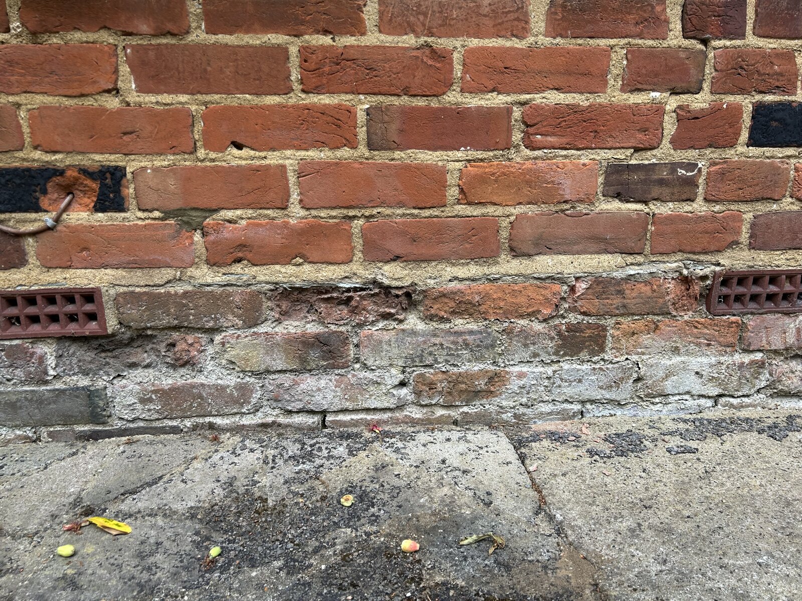 Seeking advise on how best to approach the above. As a very rough approach I’m planning on cutting back the adjacent concrete paths and excavating out c.150mm earth/debris and back-filling with pea gravel. I would also propose to install a course of dry rods to the mortar course 1 brick below the present slate DPC. Following this, the dilemma is how to address the cr@p base course brickwork. Cutting out the worst of the brickwork is obviously necessary to secure the longevity of the broader structure. However, 90% of the brickwork has sustained some damage - therefore would a cement plinth be recommend to in effect incapsulate and protect the brickwork and also provide a degree of weather protection to the exposed lower walls?