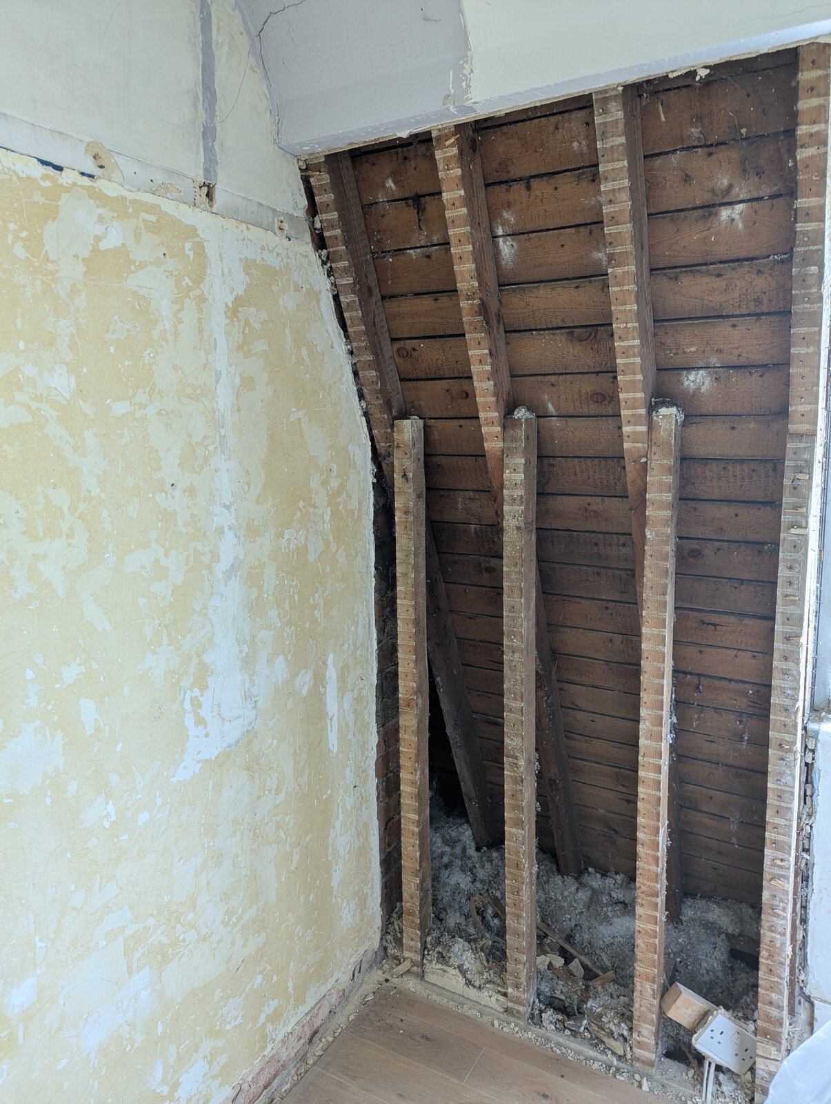 I'm getting some refurbishment work done on a 1930s house. Had some cracked plaster removed around roof overhang in a 1st Floor bedroom and found loose/blown insulation filling the gap partly. Advice needed: