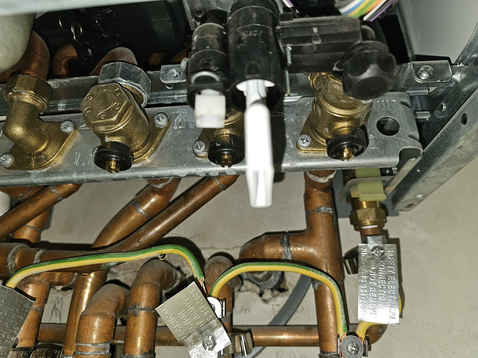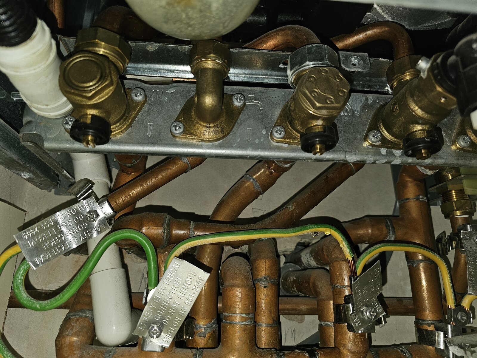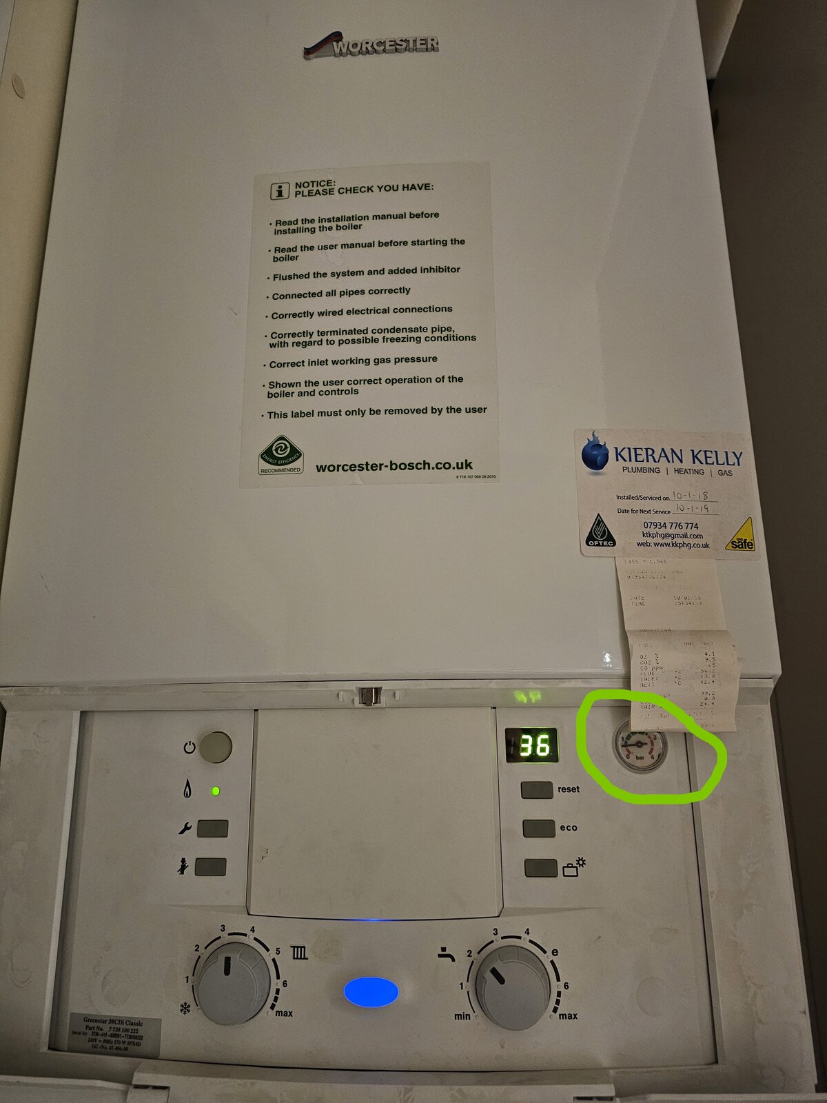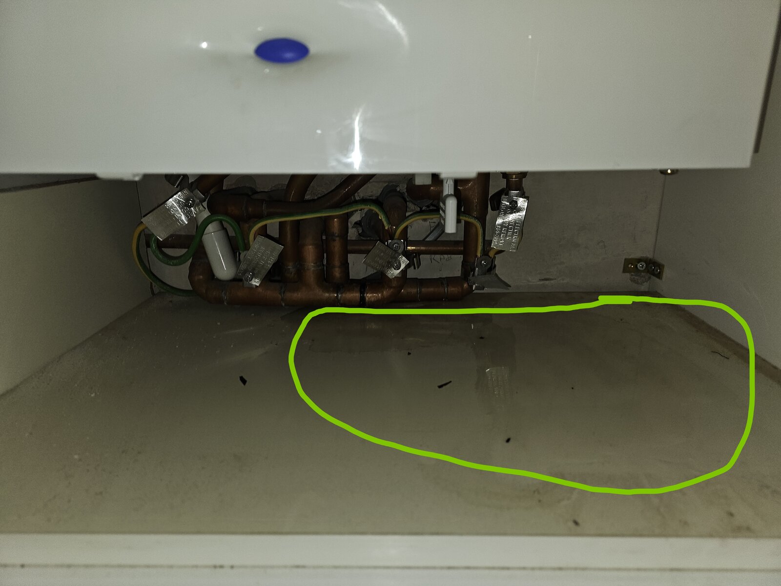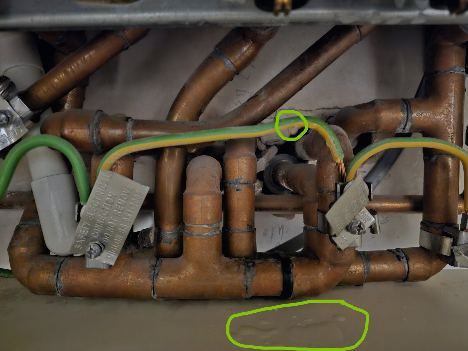 I went to check my boiler today, as I'm thinking of changing my thermostats, and noticed a puddle of water underneath it (photo with the big green circle mark up). It's leaking a water droplet every ~20-30 seconds. It's not the only issue that I've noticed in the last few months. There was an occasion where it errored with an E9 code but resetting it solved that. And then yesterday when I went to switch on the heating on the third floor (first time on the upper floors this year) it wouldn't go on. It was only when I boosted the 2nd floor that everything came on.