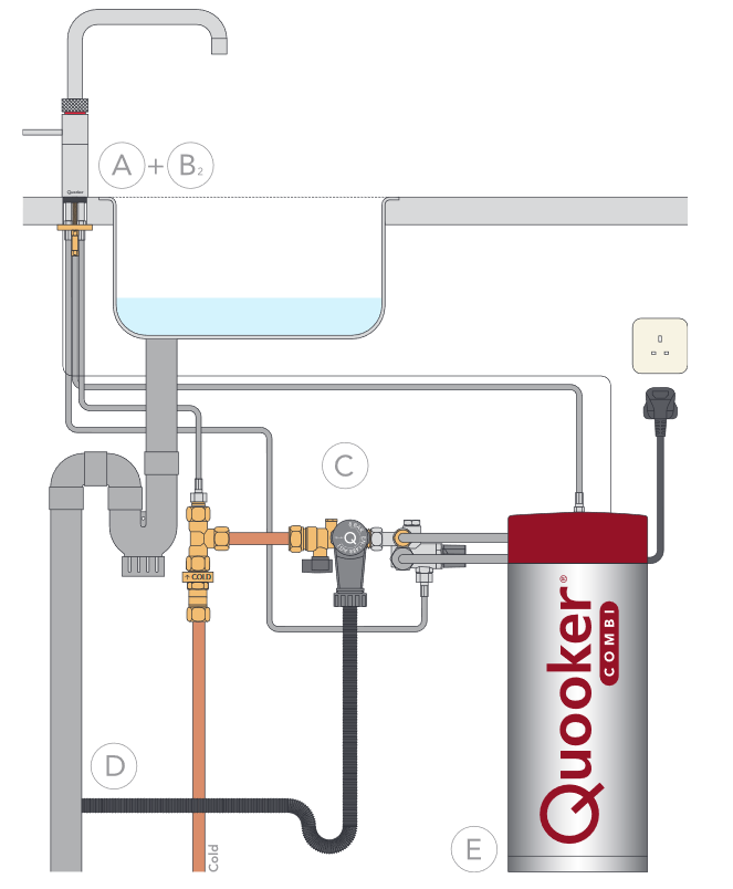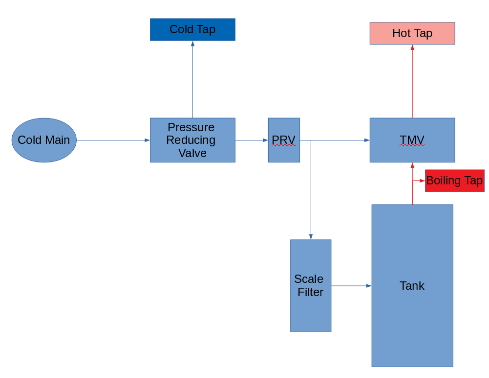 Here is the diagram for where the proprietary scale filter is installed. It only filters the water going to the tank. The water going to the cold tap, and the cold feed to the TMV is not filtered.