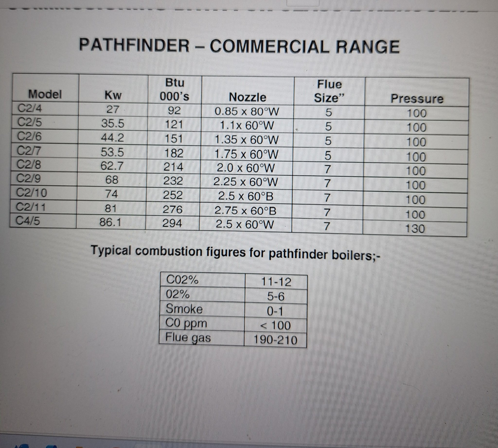 Hi. Servicing an old Boulters C2 /9or 8 pathfinder. The plate on the side suggest original set up for gas oil . The sticker on the burner suggest the same but has since been written over on pen 28sec.. Burner is an old Riello R40 G10. Written on the burner sticker is 170 psi . nozzle 1.5/60. Comb Head 3. Air 3.8 ..So not sure if that is settings for gas oil or kerosene. If the above settings are Kero would suggest about 1.95 usgallons/h