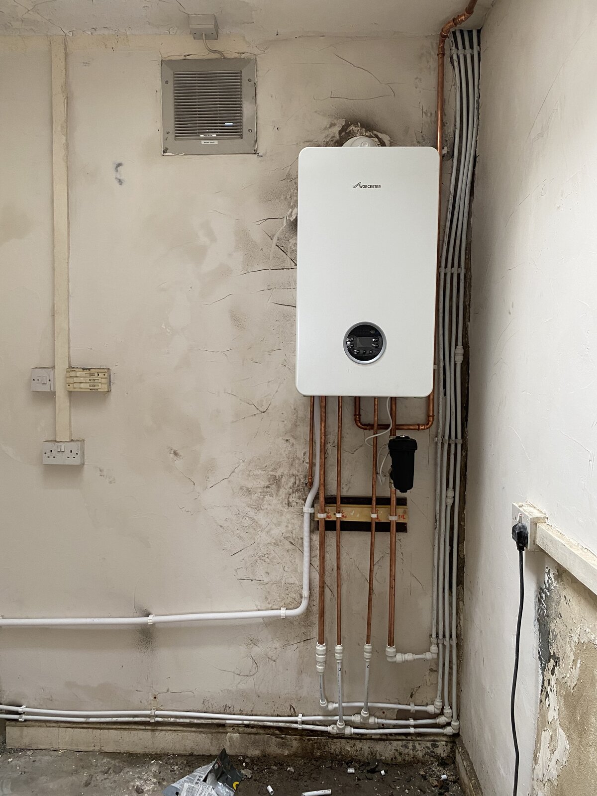 Professional plumber fitted all new15mm water and radiator pipework, brand new Kudox rads from screwfix and I bought a brand new worcester Bosch 35 combi boiler, professional gas guy fitted 22 gas pipe feed and commisioned the boiler.