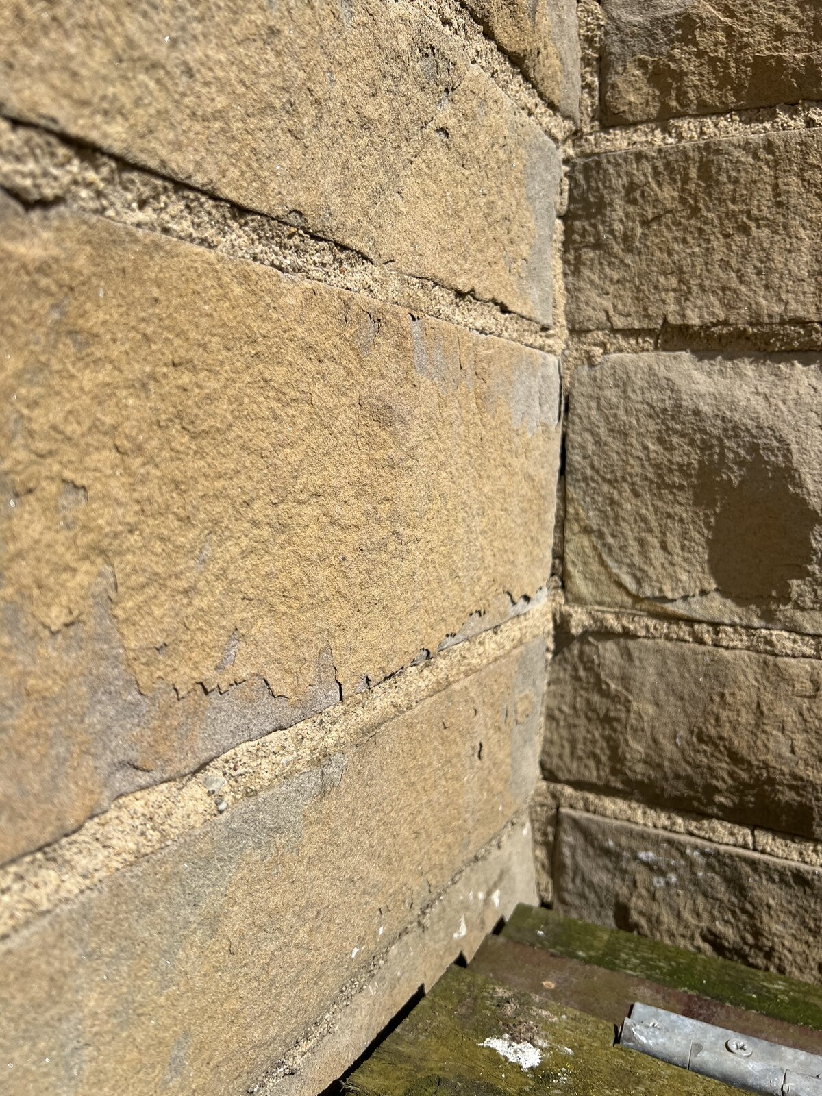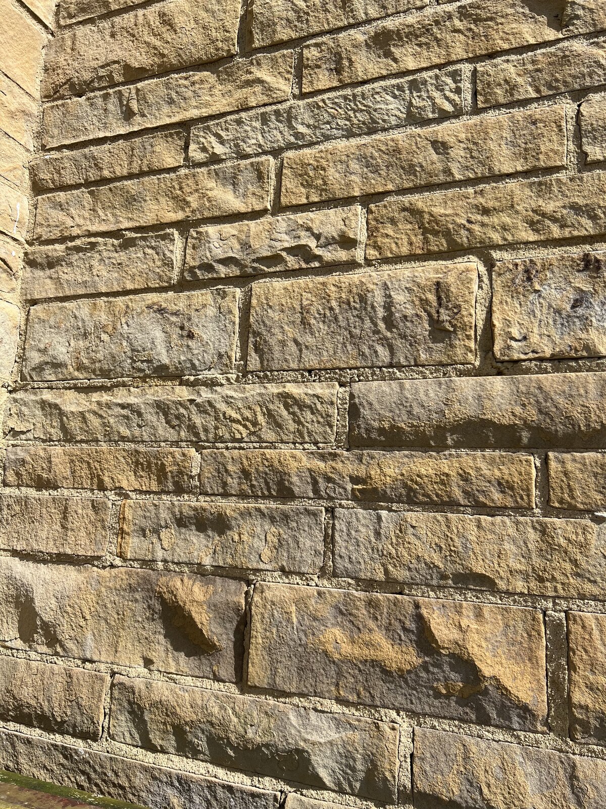 Is it possible the brick was coated with a layer of sandstone which simply is not made to last? And how would I improve the asthetics of the brick work. Additionally, the house needs repointing and in between the brick a really grainy - almost small stones have been used.