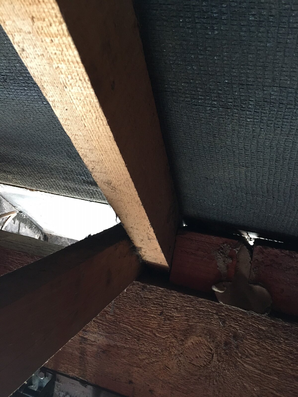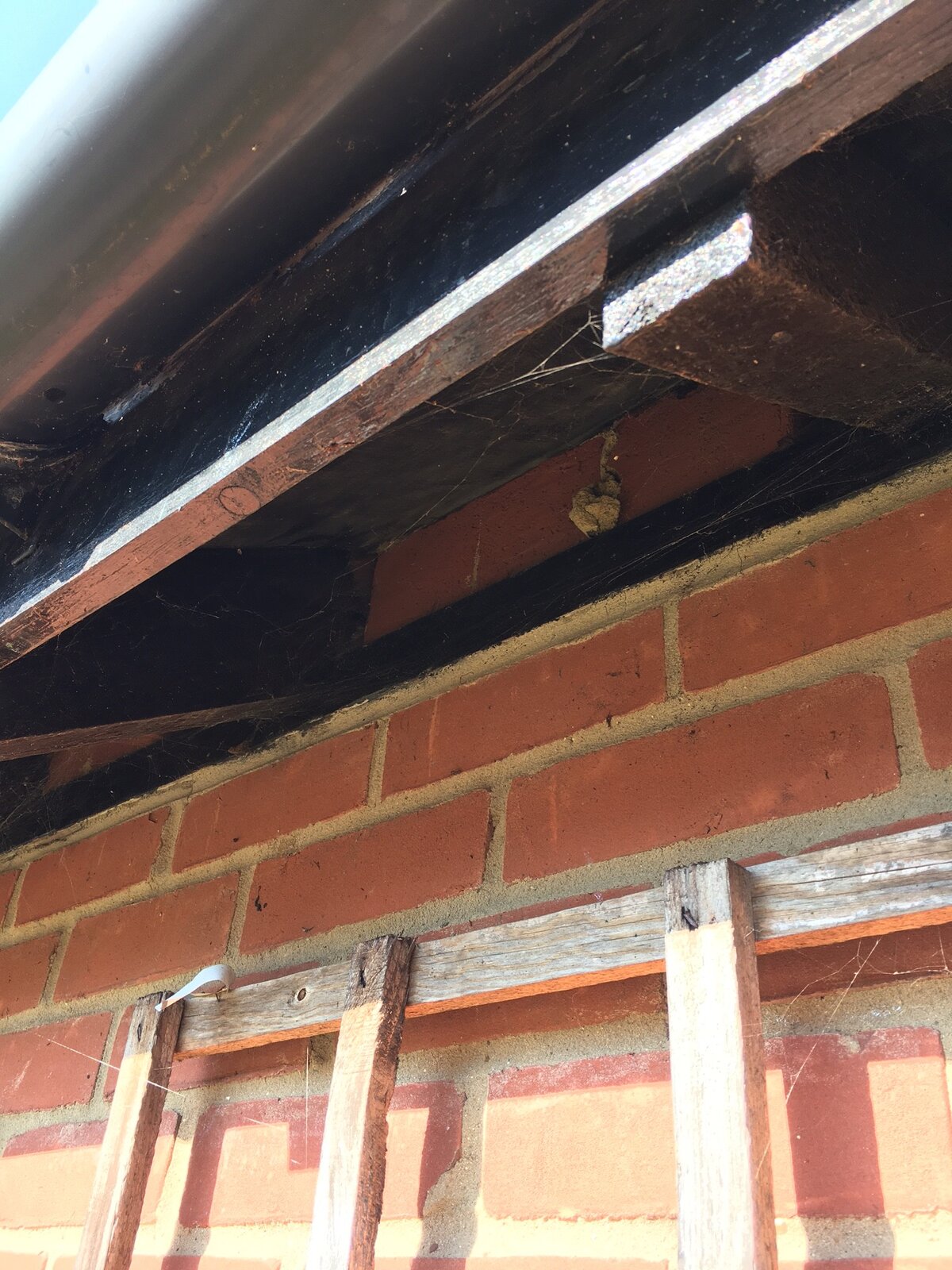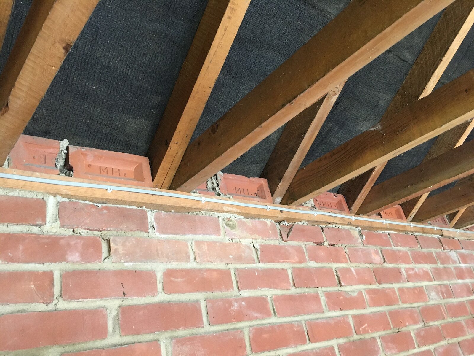 Over the weekend I spotted some dodgy looking brickwork between the walls and the roof (see attached images). Between the rafters, one and a half bricks have been cemented, on their sides, onto the top of the wall, just below the felt of the roof. This is repeated for all the rafters. The bricks don't support any weight. They appear to have been added to plug the gap between the walls and the roof, I assume to prevent birds getting inside.