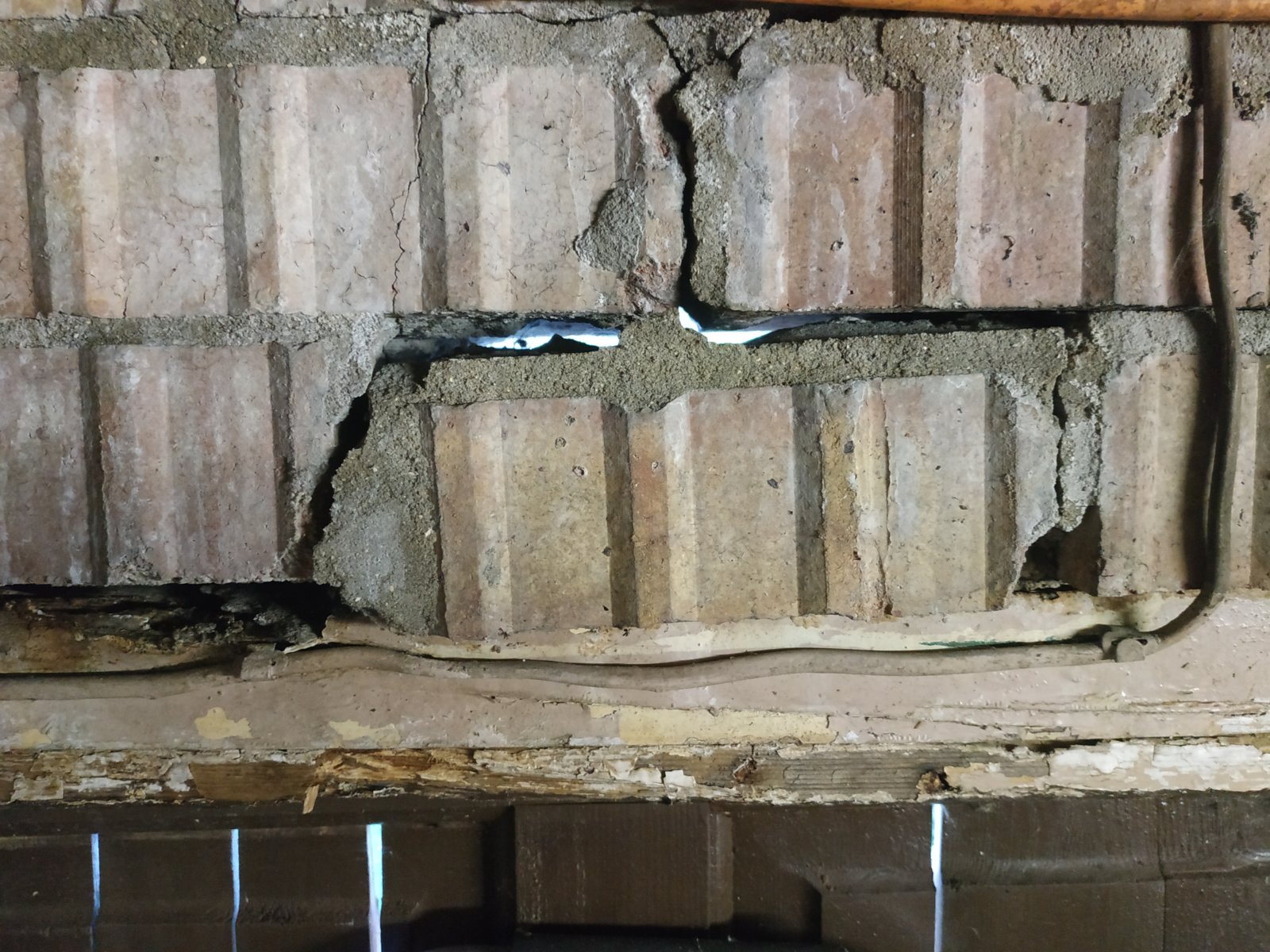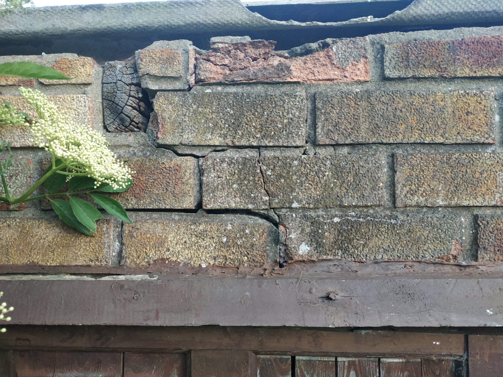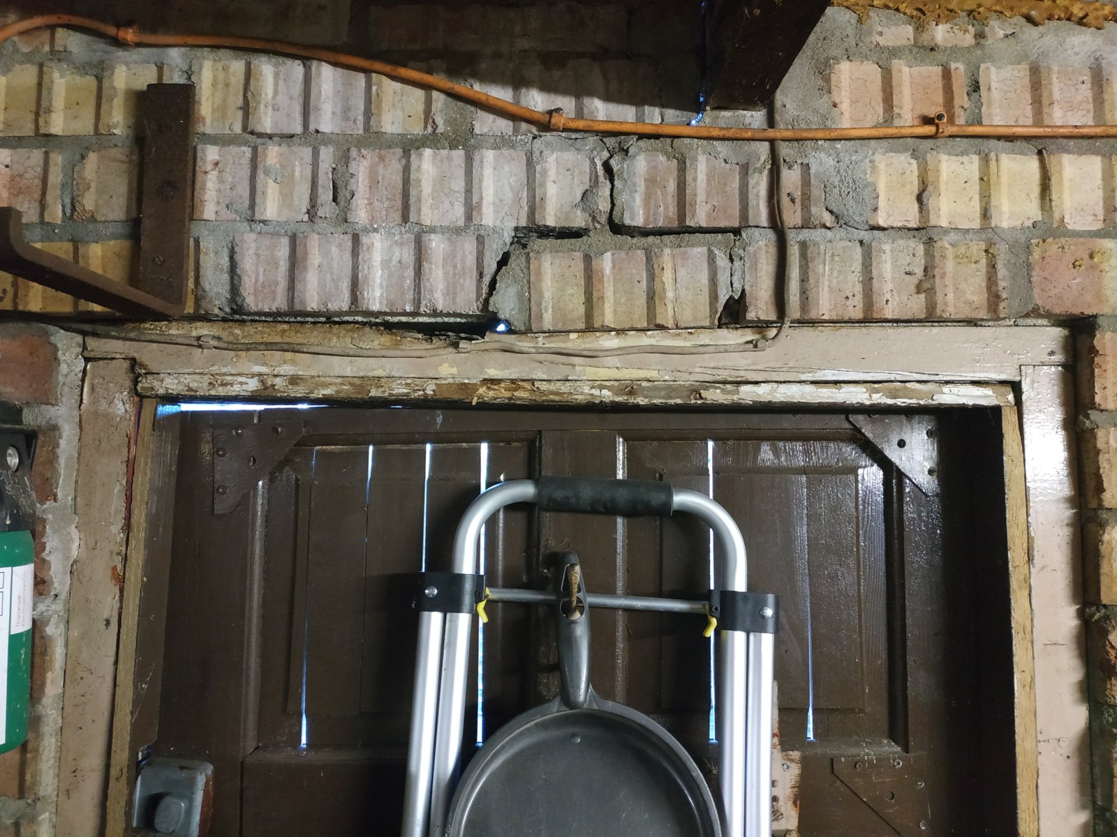 It looks like I can shove a flat lintel in there if necessary and then cement the bricks. Never done something like that before but since it's just a garage I'd like to give it a go and gain a wee bit of experience. I think I might have to support that joist as well as that seems to be the cause of it.