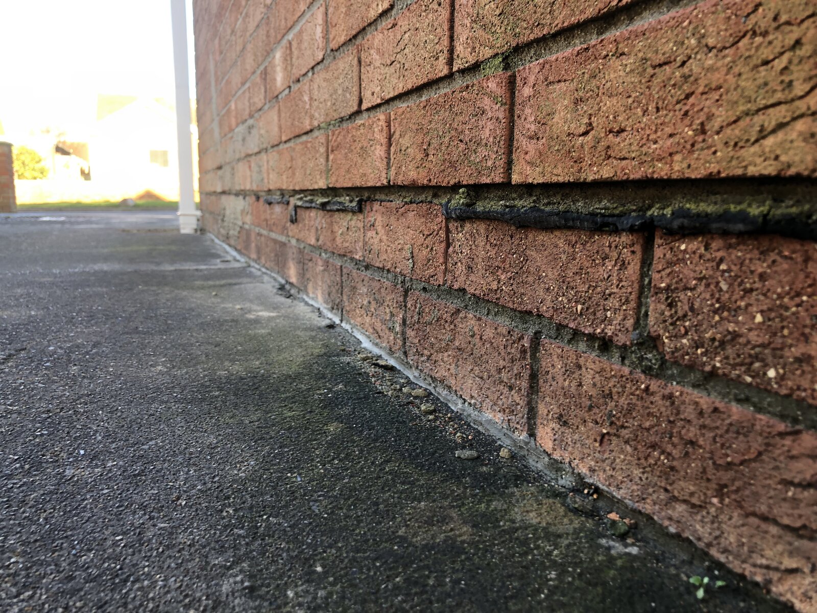 If its like that all round the house, it could be that its built on a raft (?) and that the wall above oversails the lower courses to provide a cavity wall, with a cavity tray dpc.