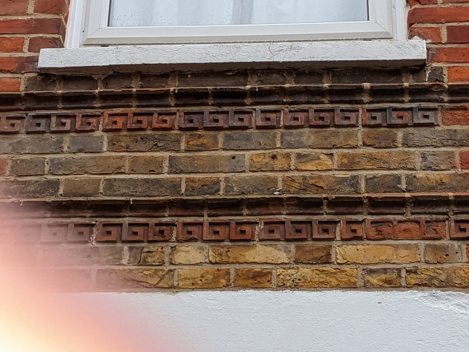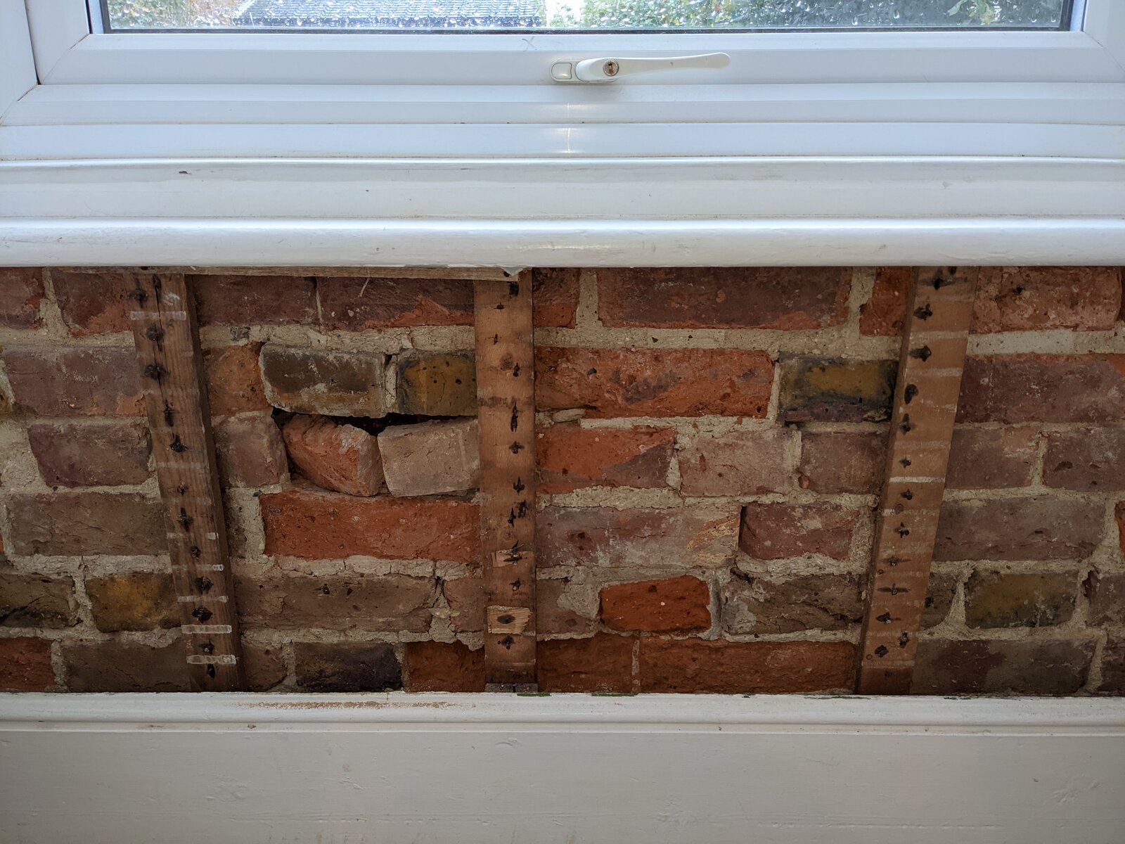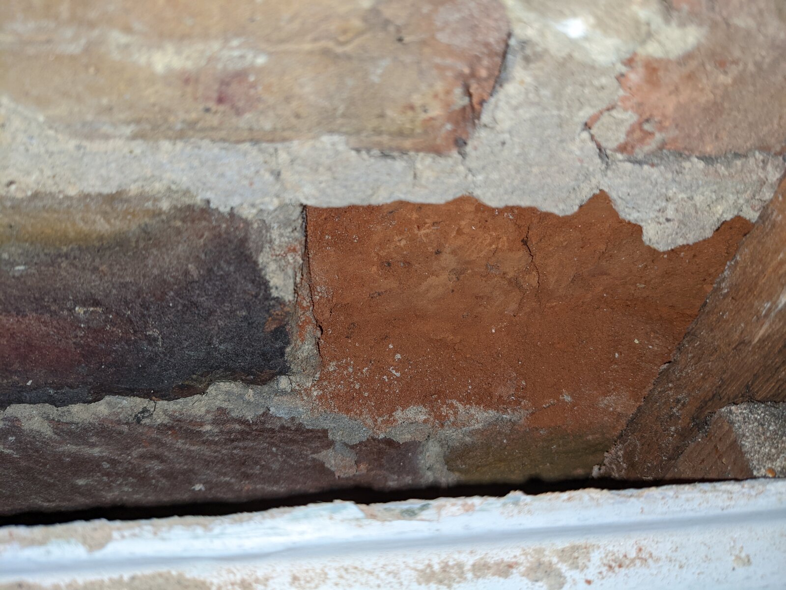 Some of the bricks under the bay window (away from where the leak was) seem to have spalled on the inside. Unsure of the cause or whether it is historic and the bricks are just old.