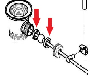 There is a rubber seat washer in the new waste (red arrow closest to the waste), but no washer for the other side of the ball. The ball fitted on the new rod is 12 mm in diameter, which is smaller than my broken rod, and the washers don't fit the new rod. Was wondering if this could be a pattern spare.