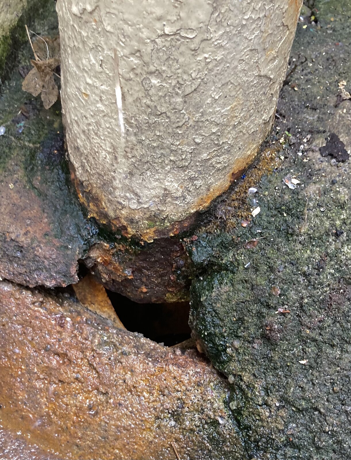 Broken concrete at the base of the soil pipe