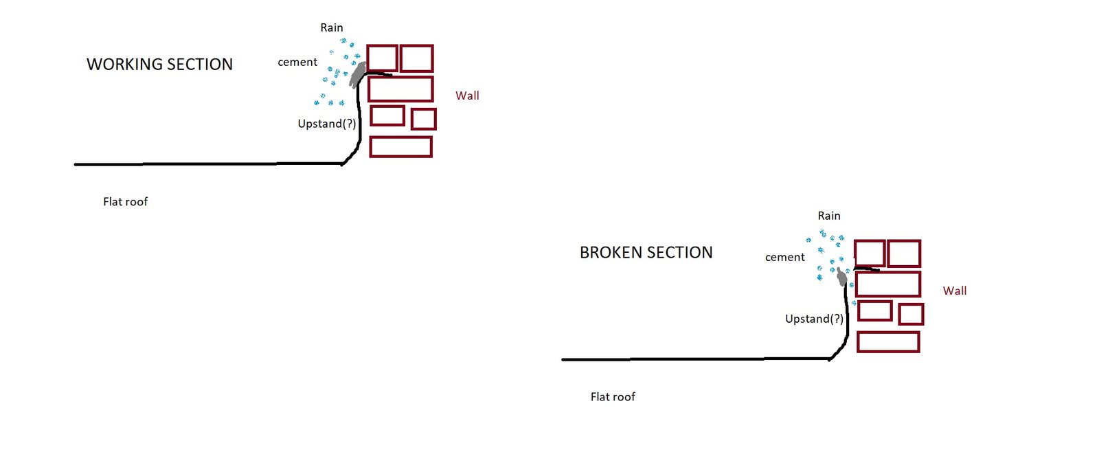 I hope the following makes sense - I have an old felted flat roof that leaked for a while and I achieved a reasonable fix with some bitumen mastic and painting the whole thing with some blackjack roof repair (the 50L tin) it's leaking again and I suspect it's the following in a few places. There isn't any lead flashing, but rather the more cheaply done tuck it into the wall and slap a lot of cement over the top - in some places, the felt has clearly torn - it looks like in one place (perhaps previous same issue) they've put a big wad of bitumen mastic over as a patch and it looks like it's made a good seal - is this the best approach? Probably time for a new roof but hoping this could last another winter...