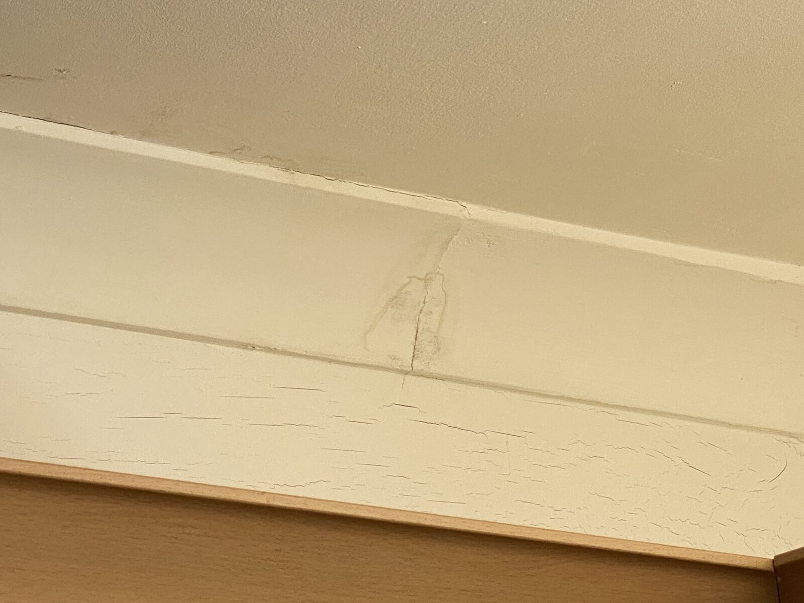 Does anyone know what the cause of the photos below could be? This is in my kitchen currently. There bubbling on one side with stains and cracking all around the kitchen where the ceiling meets the wall. About a year or so ago the paint started bubbling. It’s gotten progressively worse since. My other half was adamant the flat above had a leak while they were totally renovating it and have denied it. We informed our landlord at the time but haven’t had anyone out to sort it.