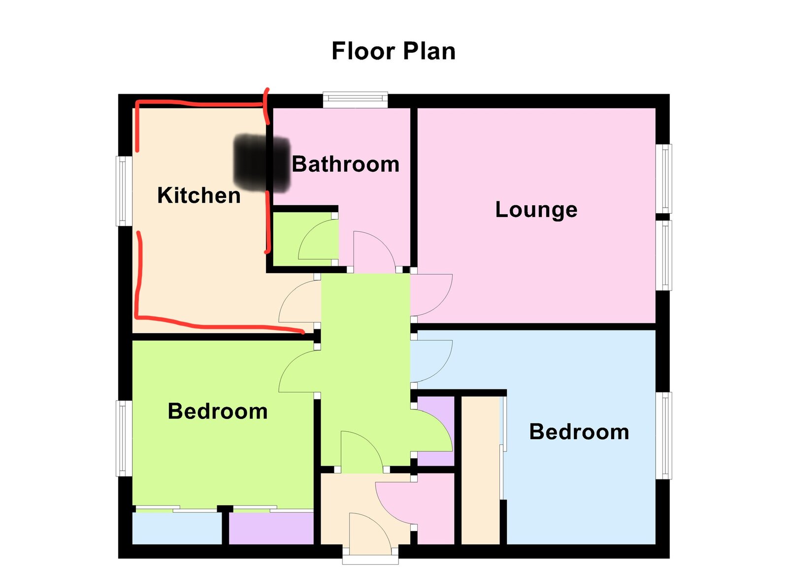 Along with the photos I have attached a floor plan of the flats with where the paint damage is. Black is the main bubbling and red is where the cracks are.