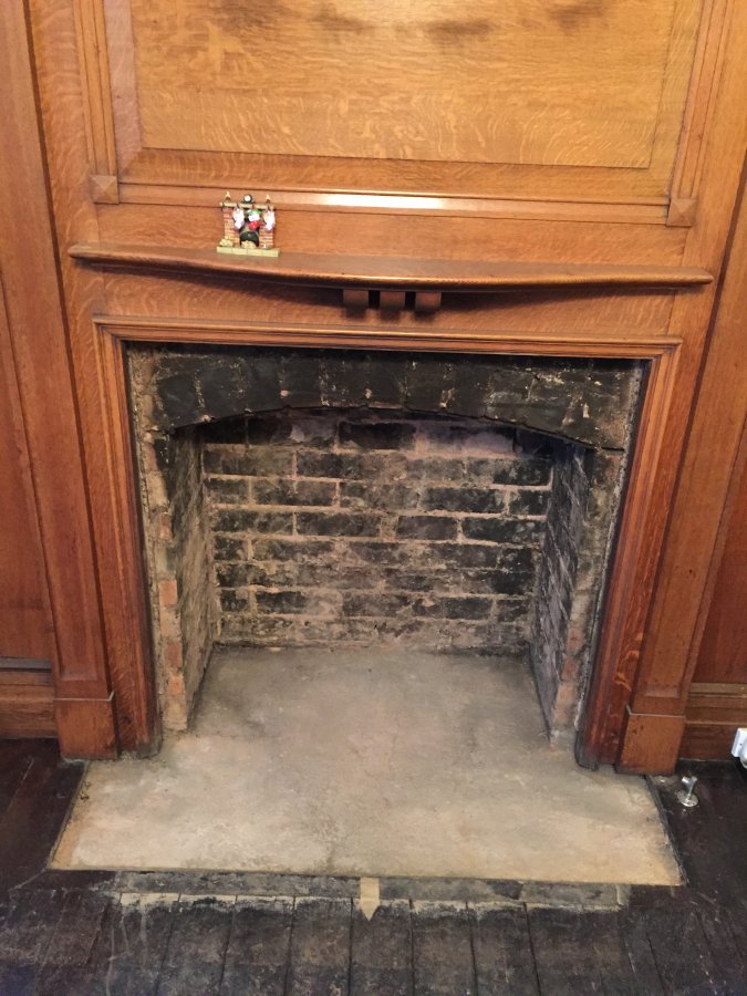 Top photo shows fireplace within the builder's opening, bottom photo has the front of the chimney at the top and the back of the chimney at the bottom with the sides curved up within the builders opening. You can see the start of this curve from the first picture