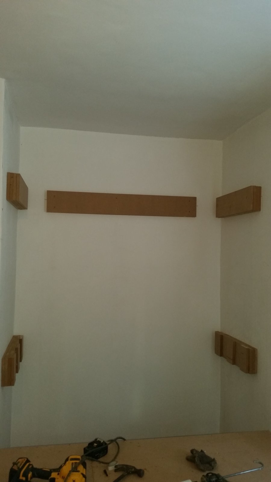 17) Fit clothes rails - The position of this took me some time to figure out. Typically they are 1.8 - 2m from the floor. Each rail needs ideally at least 750 - 900mm. But I was trying to fit in a 180mm shoe store too. Ended up at 2m exactly with an 80mm gap to shelf, giving me 845mm between rails.