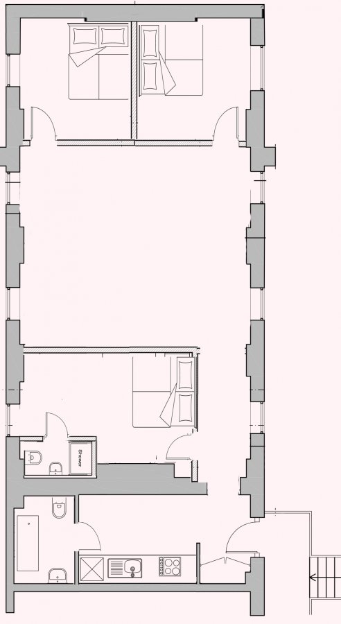 At the moment, we have a plywood partition at one end with 2 bedrooms built years ago without building control notification etc. and a large open living room. Ideally we would plaster existing bedrooms and add some nice floor to ceiling solid wood doors. And build another bedroom with small ensuite at the other end of the room. Please see plan below.