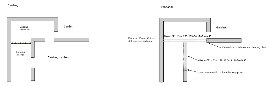 Steel beams supporting new external wall to kitchen—maximum span = 3.60m