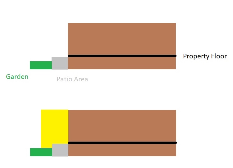 From the current property floor when extending into the garden there is a drop of approx. 0.8m which would need to be levelled off to run with the current floor.