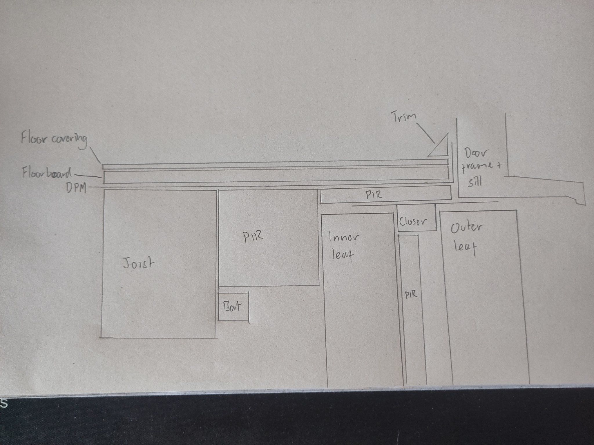 In the process I've come across this threshold for the patio door, which is currently a cold bridge as the build up is just concrete poured onto some flimsy DPC between the ends of the floorboards the door frame which is installed to the outer leaf, so that the concrete sits across the inner leaf, cavity, and part of the outer leaf (see photo). The cavity is also full of damp debris so needs to be cleared, then I'll add a cavity closer and insulate. I've come up with the attached build up which is intended to thermally decouple the masonry from the room. There is also DPM as a vapour barrier on the warm side of the insulation, which will be taped onto the door frame and hidden with flooring trim. I'll then either tape this to the top of the PIR that will go between the floor joists, or lap and tape it to a separate vapour barrier that would be laid across the joists and insulation depending on whether I use a separate barrier or just tape the edges of the PIR to the tops of the joists.