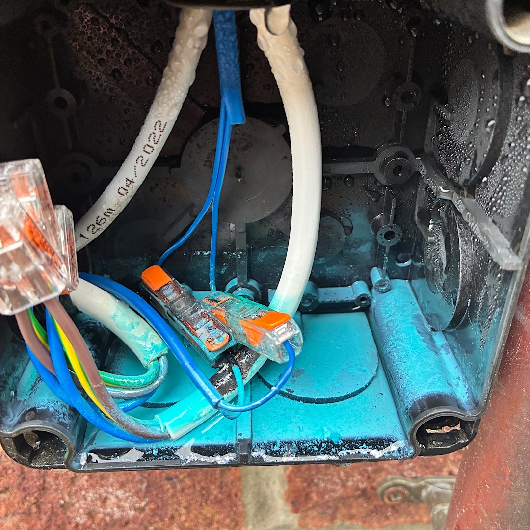 I assume this is some kind of cat? cable? Can I just carefully strip it back and apply a new wago? Clearly there is a water ingress issue which looks to be the top inlet for the conduit. Ordinarily I'd do a load of googling today but I just thought I'd reach out to the experts on here as we have no HW until this is fixed. What should I be looking at here firstly- new junction box? How are the conduit holes normally sealed to prevent water ingress etc. I would be massively appreciative of any assistance.