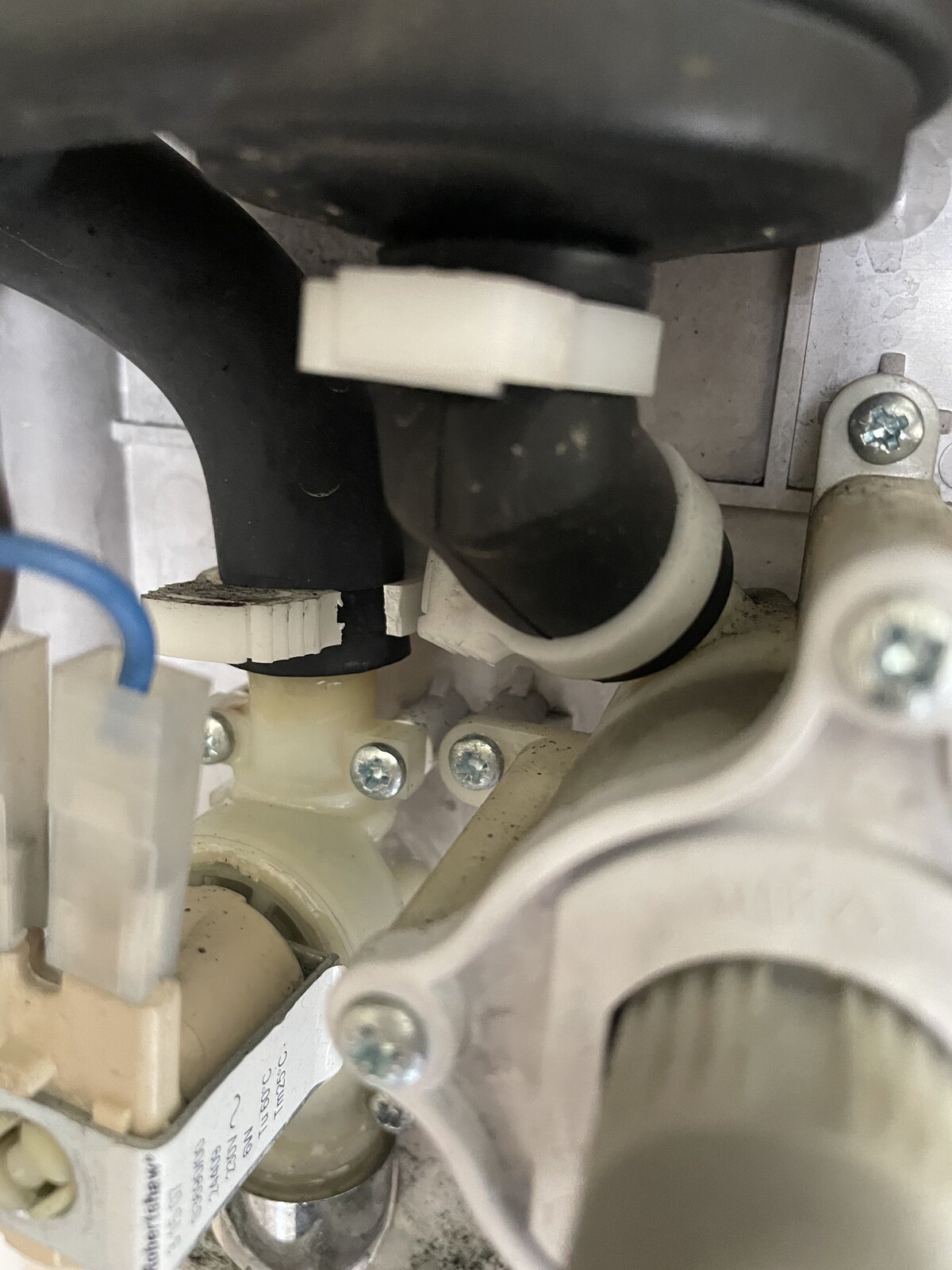 My shower started leaking from both where the shower hose goes into the unit, and from the bottom middle of the unit itself, when turned on. When it's off there is much less of a leak, but it still leaks a bit. The shower is a Galaxy 2000LX. Could someone help me diagnose the problem and the fix? Looking at the picture, the clamp on the black tubing to the left has broken, and that seems to be where the leak is coming from (makes sense). What's the part that I need and is there a particular way to fit this?