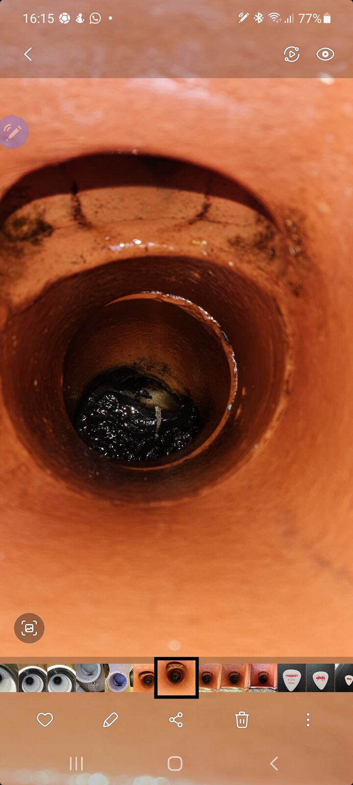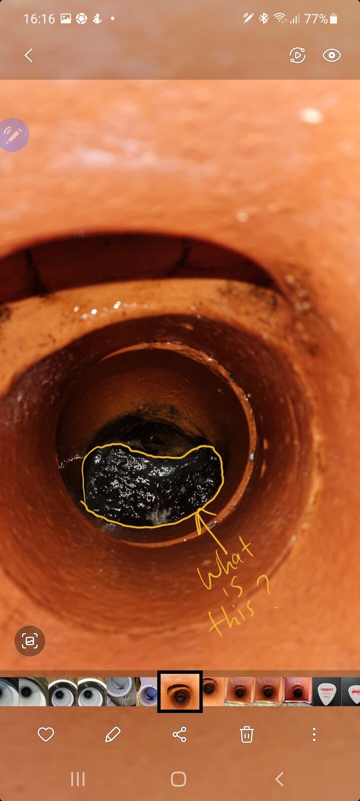 Hi there u have been having issue flushing my downstairs toilet and managed to plunge the outside hooper and pull several flash wipes up. The blockage still exists but I need some help identifying this black stone like thing at bottom of hopper please. The black thing feels solid and below the small gap the toilet waste seems to be coming up