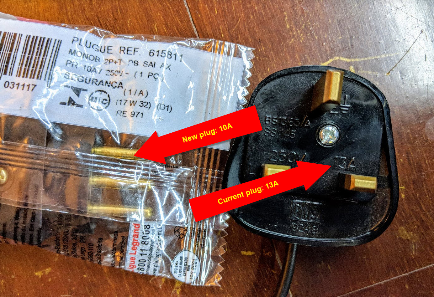 The UK plug says 13 amps, and I've bought a Brazilian plug I want to wire onto the end.
