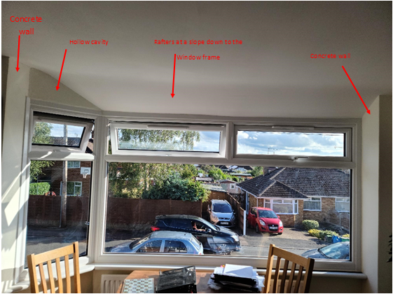 Trying to fit curtains onto a bay window but there is no wall to screw into above, only rafters.