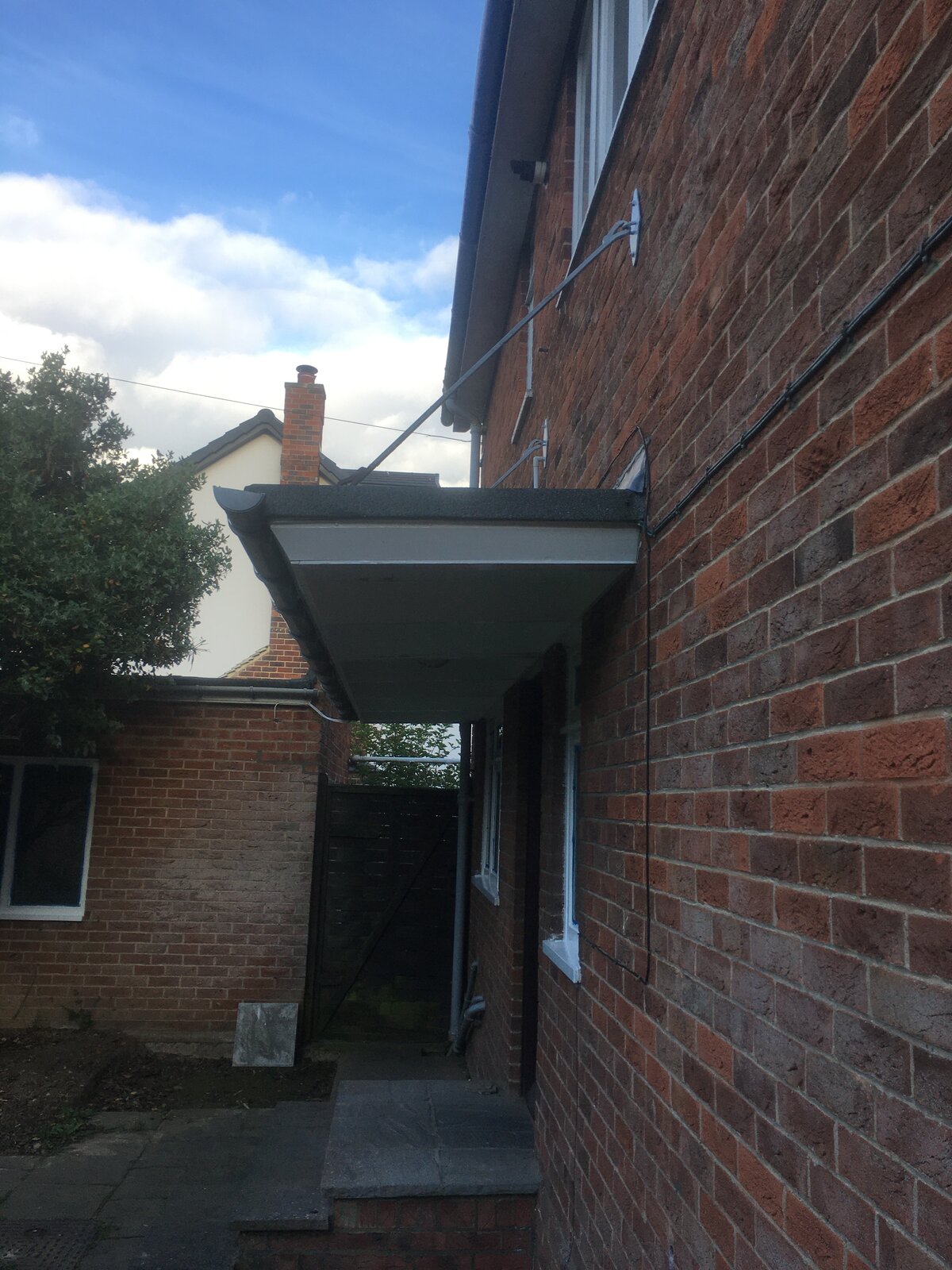 Would anybody know if I could stand on this porch roof to paint the windows and soffits? It seems solid and I think the plumber has been on to fit the boiler. Wood construction with steel supports?