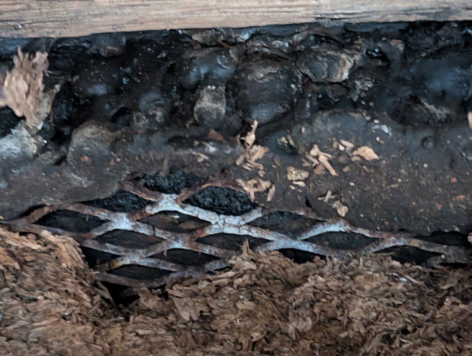 Thanks I cleared the old bulging chipboard away and underneath it looks to be a felt, tar and gravel layer which is about 2 inches or so thick it then is laid on top of a steel mesh. There's only one section where there's a hole and this is under some weird tiled gable section at one end of the garage roof, so it's never leaked any water.