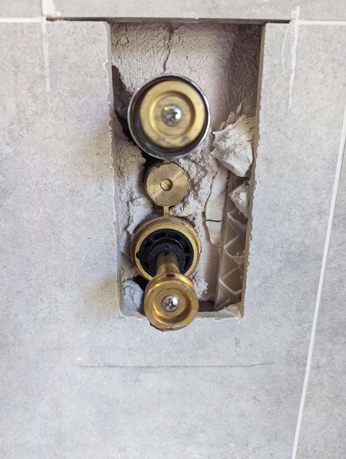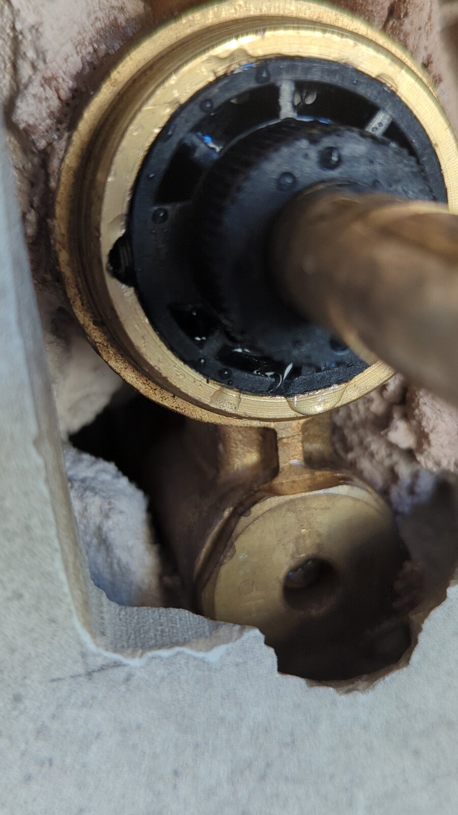 I have been trying to get our concealed thermostatic cartridge out so I can descale it, I've got this far but the cartridge just won't budge. It looks like there is a grub screw but no way to access it, no hole, and looks like it may just be a locator screw. I've tried pulling, turning, just cannot get it out. Pic attached.