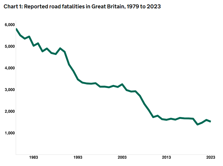 Traffic volumes (lockdown years aside) have been rising pretty much since the war! If we look at the bigger picture (rather than just the last 10 years or so, you can see that the rate of reduction has dropped off massively - effectively flatlining between 2010 and the lockdown years. Genuine question: why do you suppose that is? Cars are continuously getting safer. Traffic volumes haven't increased anything like as much between 2013 and 2023 as they have in previous decades, so it can't be that. We had about 3000 speed cameras in the UK in 2004 and 7000 in 2022. We've had widespread speed limit reductions since then, and even more enforcement, yet the figures remain stubbornly similar. So why do YOU think that is?