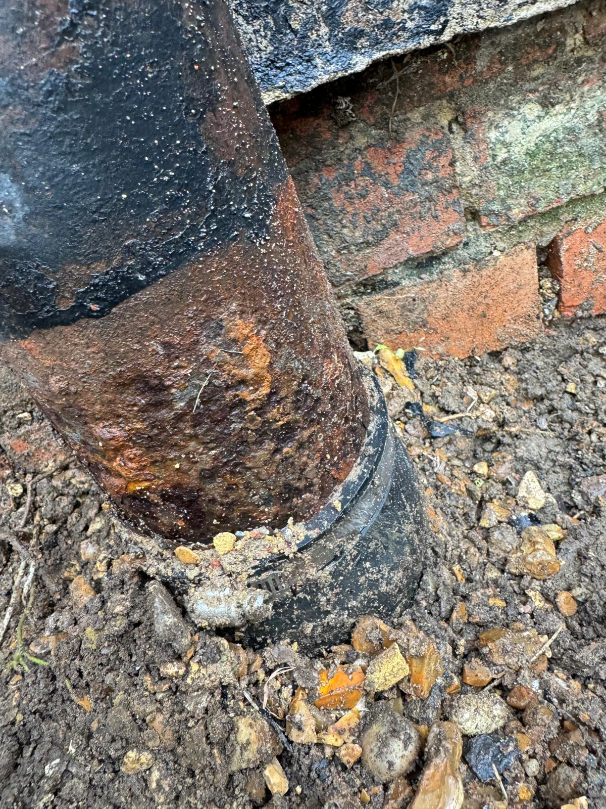 The rusty cast iron is worse than I have seen after a hundred years. This might have been accelerated by long term leaks in the ground. It might need to be replaced. If sound, you can wire-brush to clean metal, apply a rust-killer such as Kurust followed by a metal-protective primer and oil based gloss paint system. Hammerite is sometimes used but unsuitable because rust can grow under the paint film, and it is very difficult to strip off or recoat. It would be very preferable to replace with new.