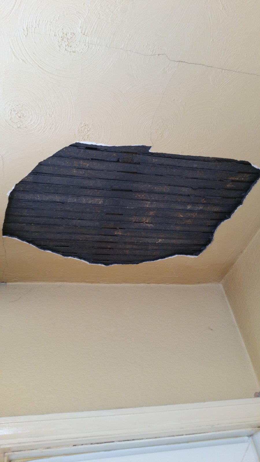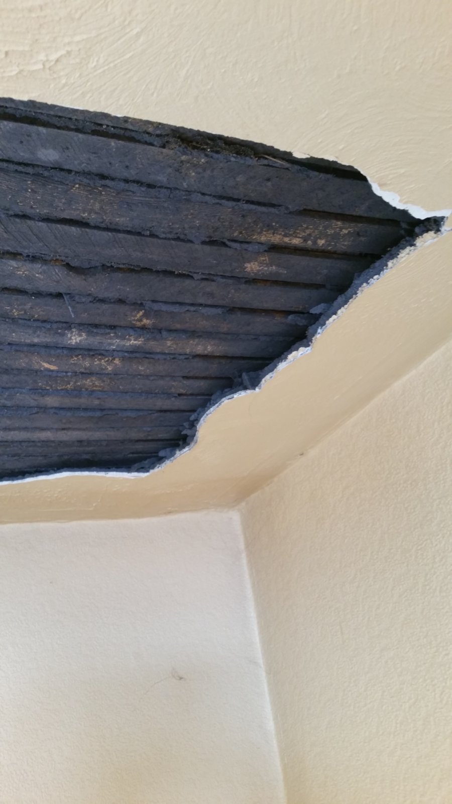 I'm thinking just age 1930s ,the plaster seems fine elsewhere that's why thinking just cut back square to stable plaster and either screw board to joist or fill.