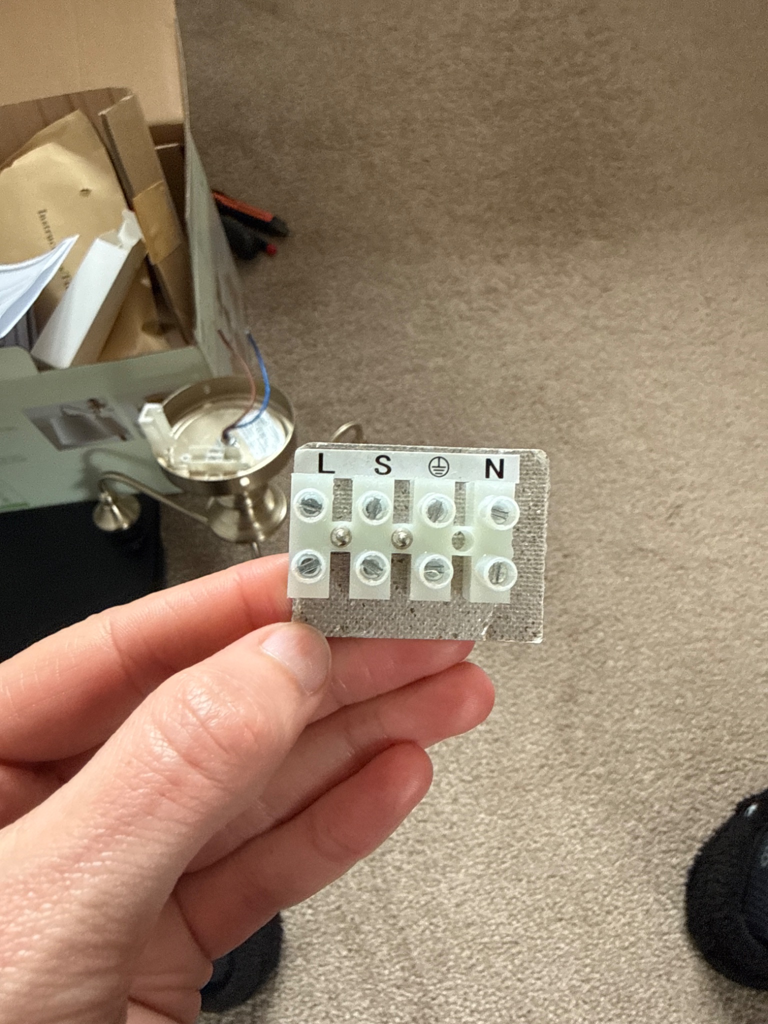 Trying to fit new light and forgot to take photos of old wiring. Only one red wire picking up on meter unless I increase sensitivity and then one of the black wires is picked up. New light fitting only has small junction box with one brown and one blue. Have tried multiple combinations and can only get light to work when permanent live is wired in - and switch not turned on! Old light had wiring connected to the block in second photo.