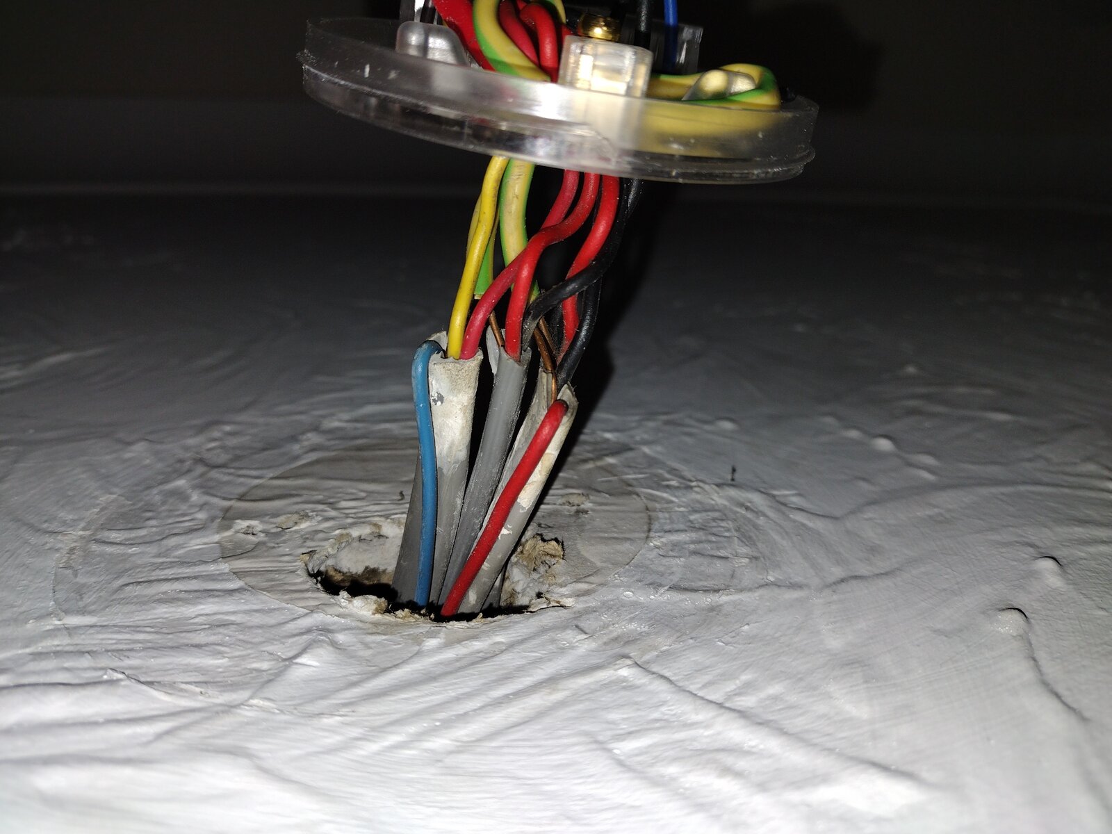 Again, I very much doubt if the Red and Blue wires "poked up" into the ceiling void are doing anything.