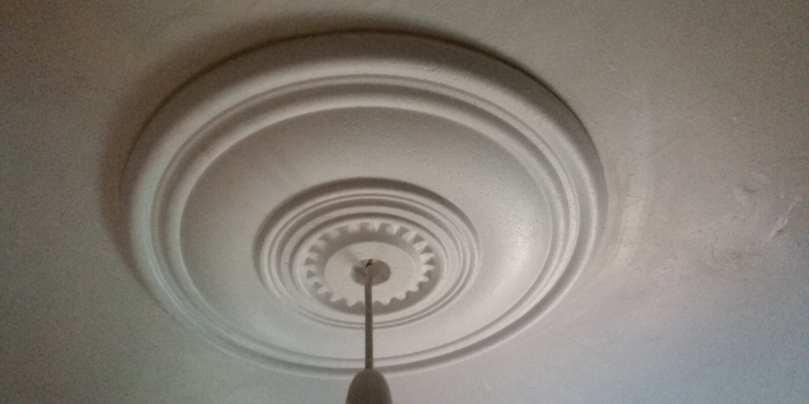 My wife has purchased a lightweight ceiling rose (polystyrene) , she's the designer and I'm the magician that's going to make it all happen ( sigh!) It's move or less flat , I've done one before with no issues. I removed the light fitting and there's a lot of wires up there as well as a hook built into the fitting to support the quite heavy fitting which is staying , the only thing I can thing of is to totally remove all the wiring , re wire with block and fit a hook into the above beam to support the fitting and then fit the ceiling rose , I can't think of another way to do it as the rose is flat , any ideas ? , Thanks . I have included a picture of the previous one I put up , however there was significantly less wiring on that one
