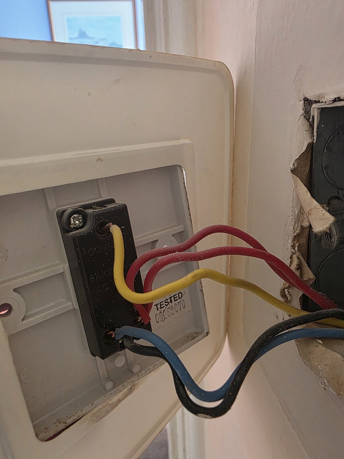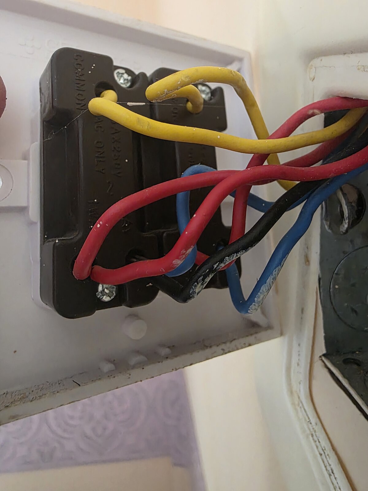 This is an upstairs landing light, which is controlled from a single upstairs switch and a double downstairs switch. The other side of the downstairs switch controls a downstairs light, which is also controlled by an additional single switch on the other side of the room.