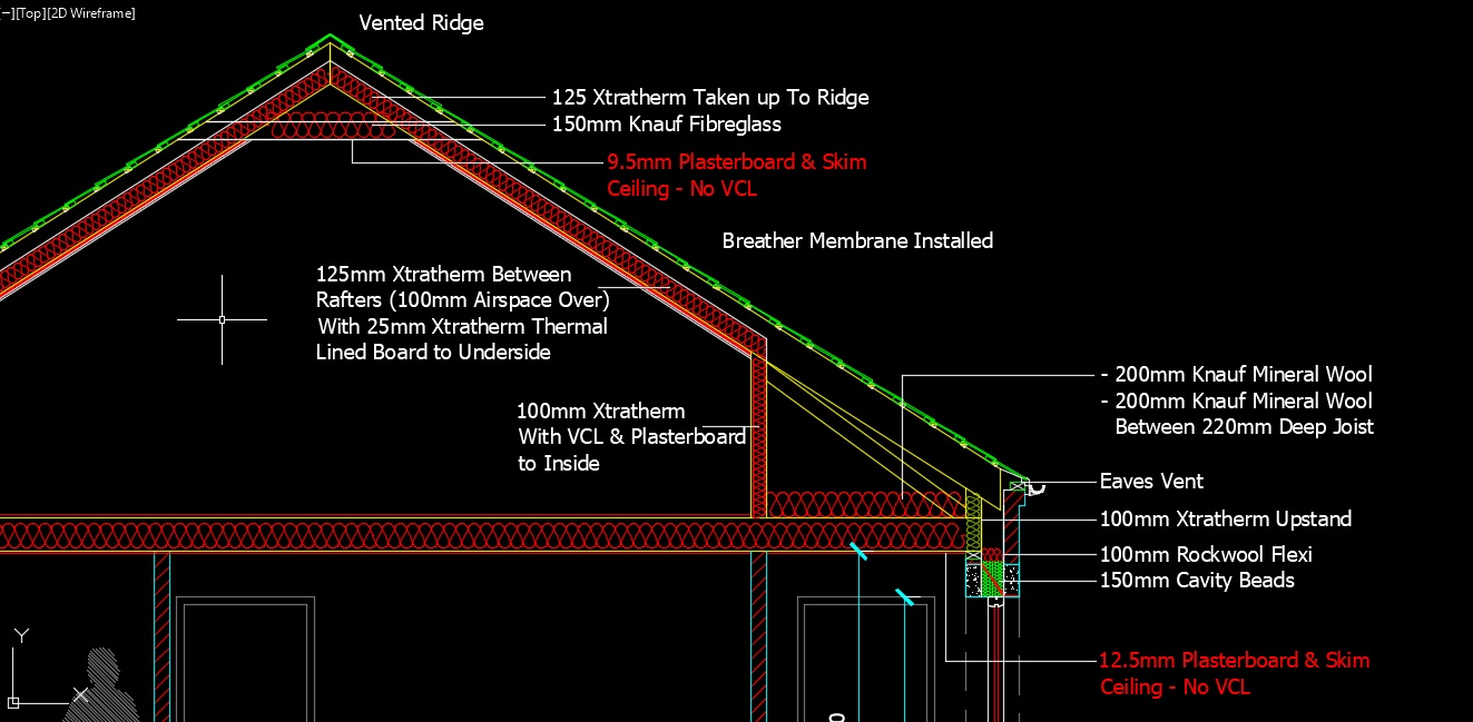HI, I am new to the forum. I have a new build finished and been living in this past year. The builder forgot to add vapour control layer to the ceilings as shown in red on the attached section image. 2 coats of emulsion paint have been provided to the ceilings. There are no visible issues but I just wish to be sure and prevent any future issues, if there are any. I have checked the condensation risk analysis on Elmhurst Energy for the ceiling at the eaves. It states there will be condensation here on the top layer of fibreglass but it is not a condensation risk. I assume this is due to the eaves and ridge vents providing enough ventilation. The ceiling joists at the ridge also do not have a VCL installed. The Xtratherm insulation has been installed between the rafters up to the ridge. There is no insulation below the rafters once it goes above the ceiling joists. Would there be any condensation issues here as I am unable to enter this situation into the Elmhurst software?