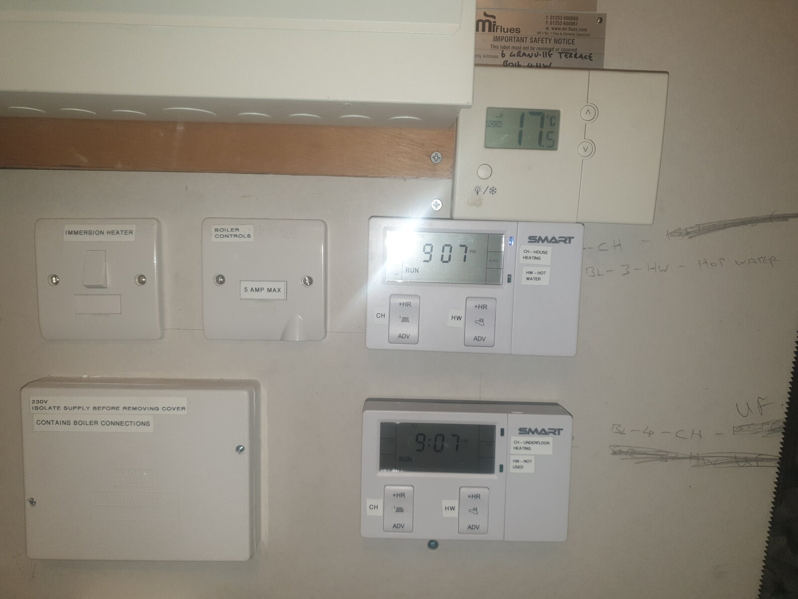 Basic wired on/off controls for water and CH (and RF thermostat) and another wired on/off for UFH (with wired room thermostat).
