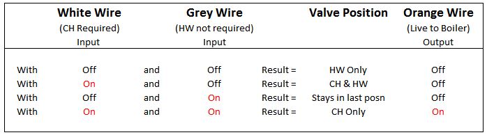 This clearly shows the valve with orange not connected cannot return from position H to W after boiler fires unless power is turned off. When heating and hot water are both on valve is in mid position. When room stat turns off and there is still a cylinder stat demand for heat the valve returns to W position.