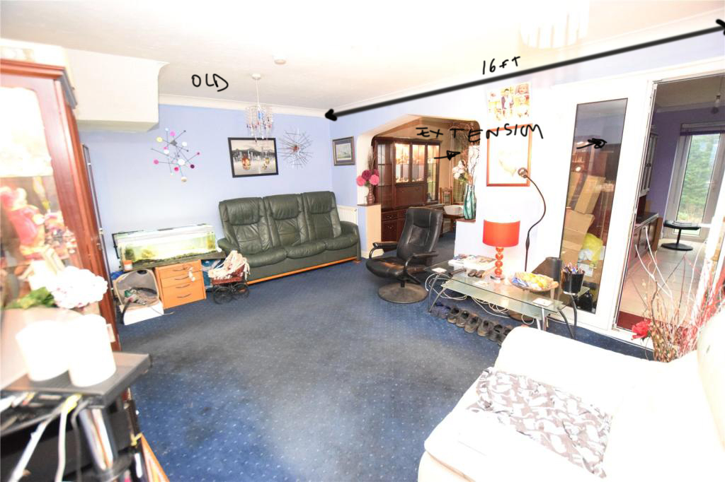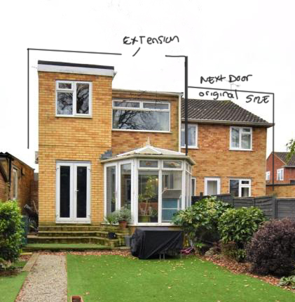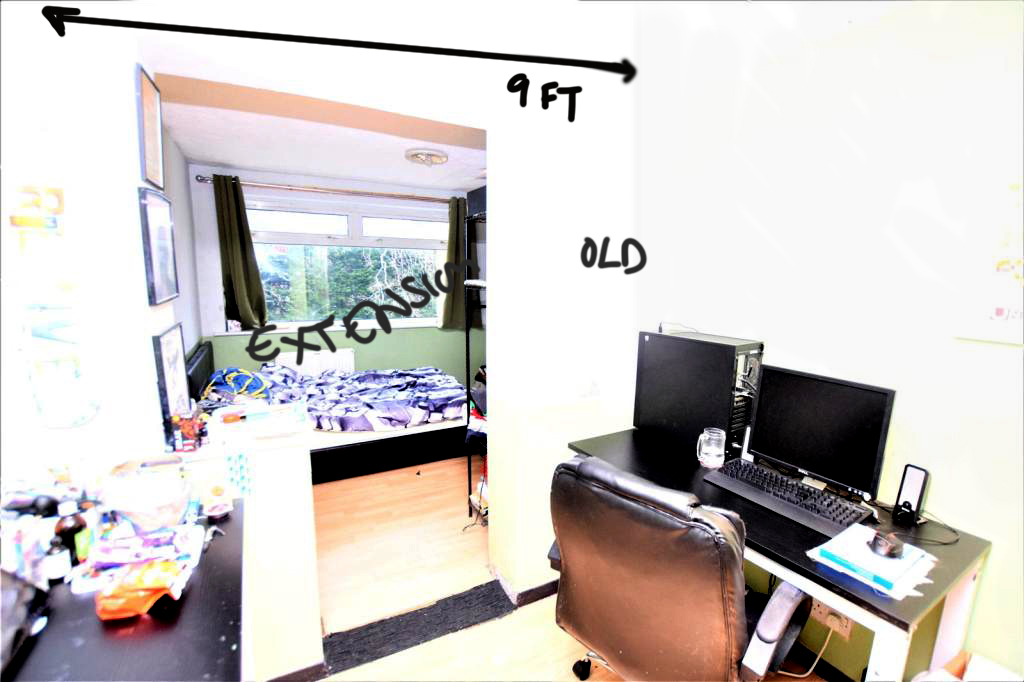 The issue is the original rear wall of the house (a supporting wall) wasn't removed for a joist to be added so the original rear wall is now in the middle of the living room and bedroom. The current owner just had 2 archways on the ground and 1st floor cut into the supporting wall, which leads into the double story extension.