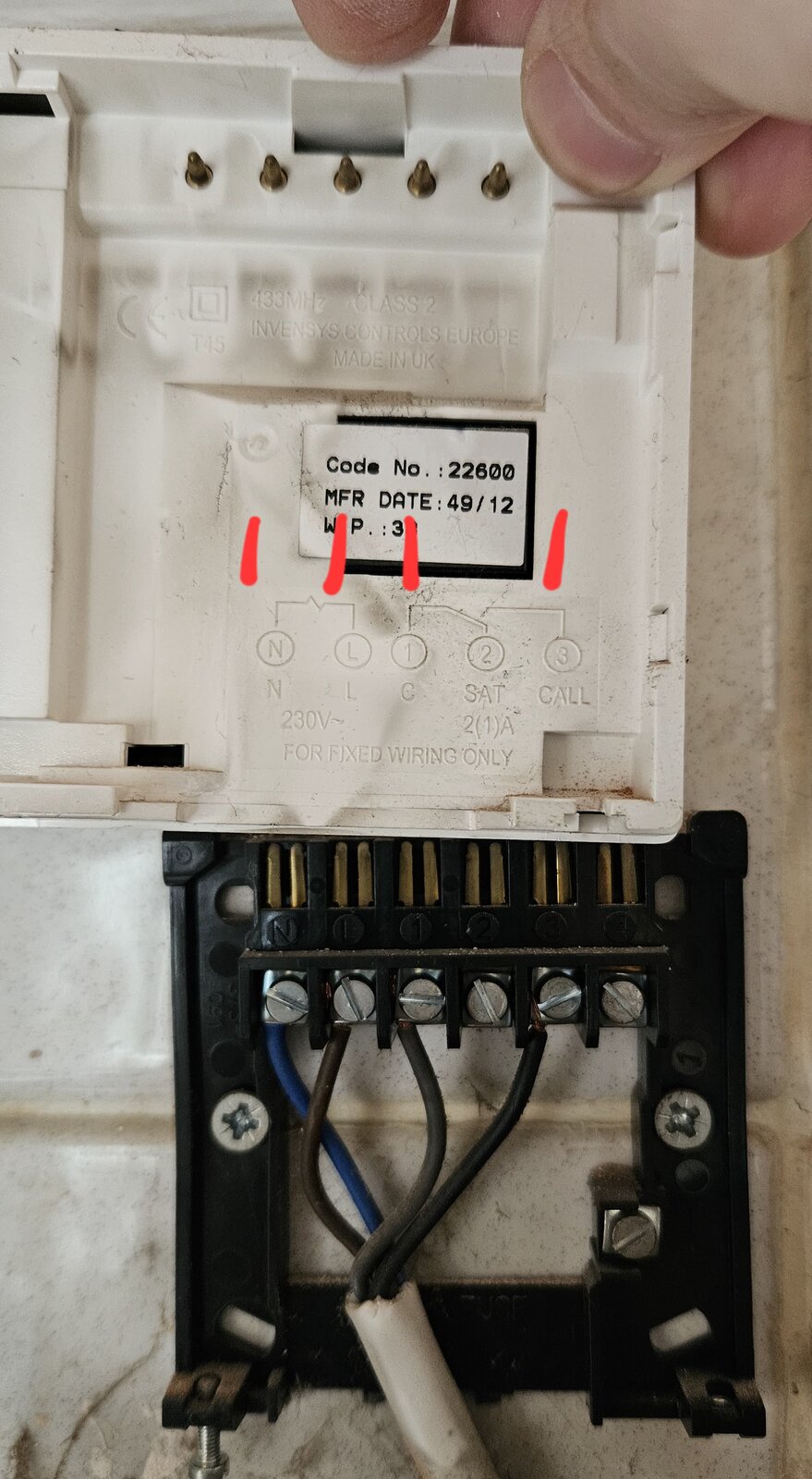 I have just opened the faceplate of the existing reciever (mains elec switched off) and as expected there is Live, Neutral and then the other cables connected are: