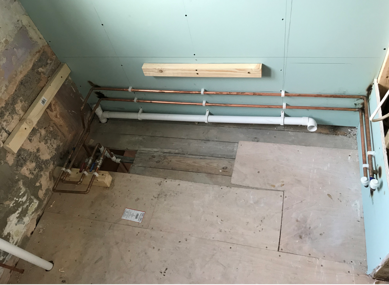 I will still send the waste pipe in between these joists and keep them below floor level but will now have a pedestal basin with the waste pipe and water pipes running behind this.