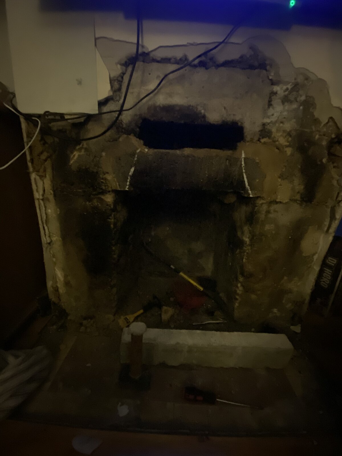 The bit above it is the throat of chimney the pots are on this , the lower lintel need to be removed gor the flue of the log burner , the lower lintel hadn’t any bearing now and the chimney breast is cast concrete would I have to put another lintel in if I remove lower one , it’s all seems to be cast together tight