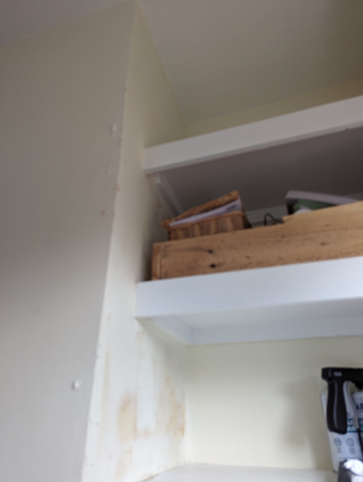 You'll see from photos damp is in 2 rooms, that are back to back, and share the chimney stack. 1 of the rooms is an extension (room with shelves) to main building and we're not sure if the damp is caused by stack condensation in both rooms or possible the flashing that connects the annexe to main building has issues and water getting in. The damp is at the same height and place on opposite sides of stack. In 1 of the rooms you'll see a vent, we had this previously core drilled as we had a damp issue collecting in cupboard built-in to the old fireplace, and were told ventilating would solve that.
