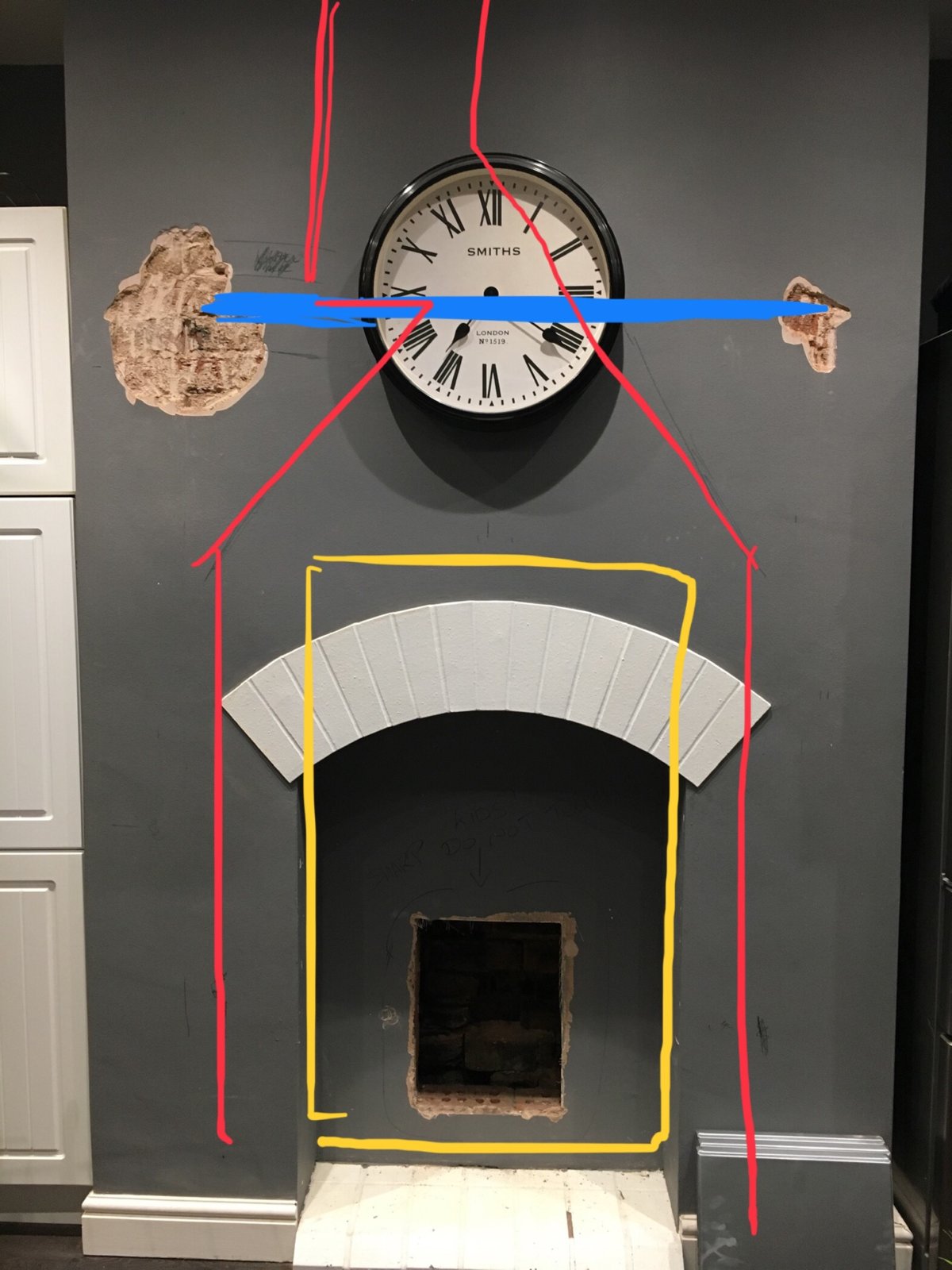 Just a quick question about opening up this chimney for a range cooker and extractor. The builder has asked how high I want the lintel which is generally 750 clearance from the 900 worktop above the gas hob...which is just about the blue line on the picture.