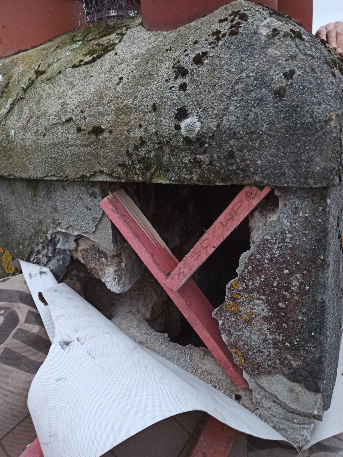 The tricky thing is that it is a shared chimney with our neighbour and after being up on the roof with him he thinks it is repairable in situ with some cement blocks and mortar and that will be fine as it doesn't need to take a lot of weight. However the roofers are saying it would basically need to be taken down until they get to solid all the way around and then rebuilt.