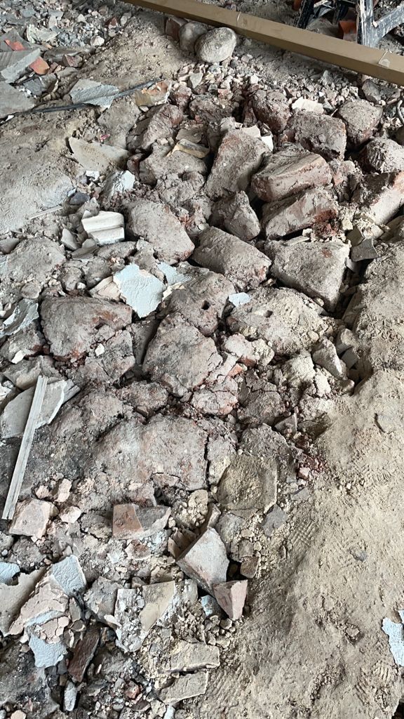 We're at the 'hard core' stage, but the floor base which is about a foot deep is a mixture of brick, a large amount of clay (huge lumps of it dug out from extension foundations), and a fairly large amount too of plaster/soot/bits of wallpaper.