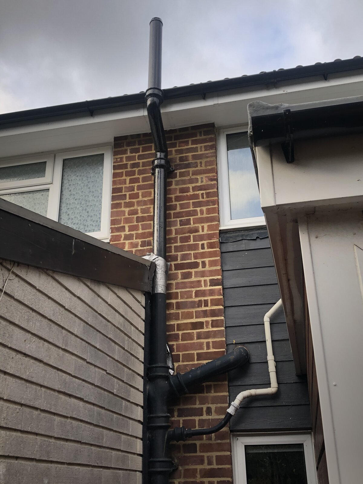 The soil pipe is in the back garden between the neighbours house as shown in the pics. Guttering also in the back garden.