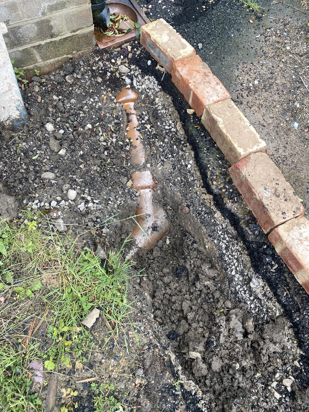 We are currently digging some footings for a small open porch, we are digging these to 600mm and we have found a clay rainwater pipe in an L shape like the attached photo.